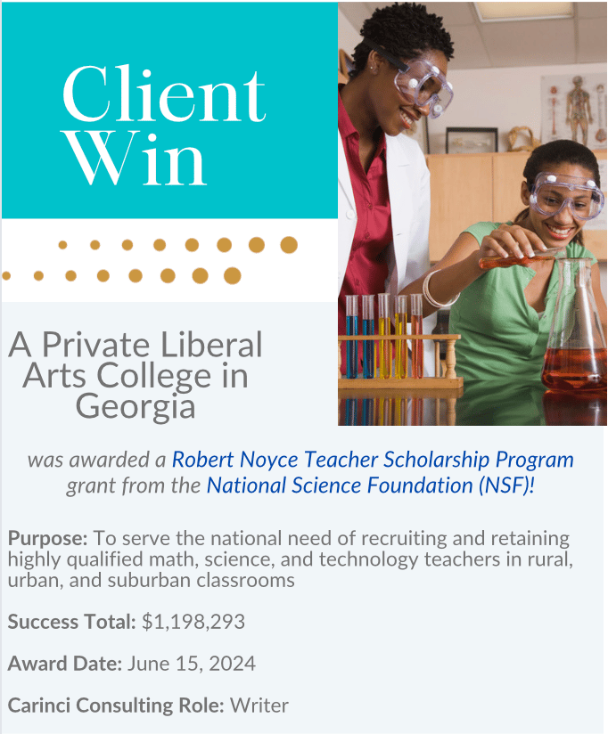 We are thrilled to announce that our client, a private liberal arts college in Georgia, has been awarded a Robert Noyce Teacher Scholarship Program grant from the National Science Foundation (NSF)!